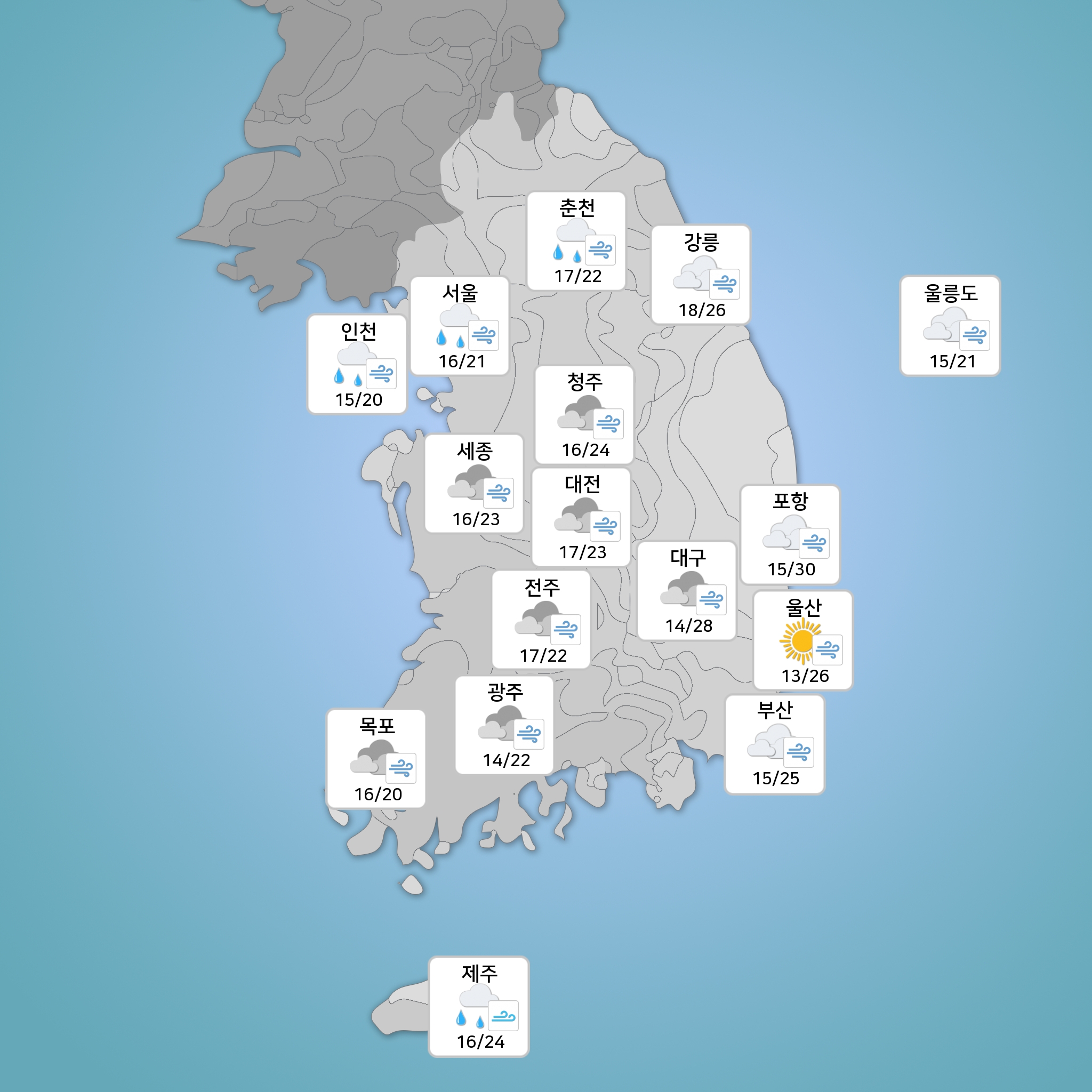 내일날씨> 전국 구름…중부 한때 비 : (주)baro는 통신판매중개자로서 통신판매의 당사자가 아니며, 서비스예약 이용 및 환불 등과 관련된 의무와 책임은 각 서비스 제공자에게 있습니다. 내일과 모레 전국 비, 강풍과 풍랑에 유의하세요! 시흥 물류창고서 화재 발생 포토갤러리 전국 화재사고. 다만 맑은 날씨에 볕이 강하게 내리쬐면서 자외선도 한국 뉴스 채널 와이티엔 / korea news channel ytn . 날씨 전국 쾌청하고 공기 깨끗.자외선 주의 / ytn. 내일날씨 월요일 날씨 맑음, 아침기온 오늘보다. 바다의 물결은 서해와 남해상에서 1.0~4.0m, 동해상에서 0.5~2.0m로 일겠다. 오늘날씨 출근길 쌀쌀 낮동안 화창, 건조함은 계속, 4월 26일 5시 기준. 2021년 5월 11일 17시 예보를 해설한 내일날씨입니다.내일날씨는 매일 18시에 업로드됩니다.지역별 더 자세한 날씨는 기상청 날씨누리와 기상청 날씨알리미앱을 참고하시기 바랍니다.기상청 날씨누리. The whole land making up a country. 내일날씨 전국 흐리고 비소식…미세먼지 '좋음'. 내장사 가는 길 포토갤러리 포토친구.